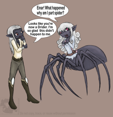 Here's another picture for the 100 pictures thing. This one turned out too obvious; not so much "Surprise" as, as they say, "Bleeding Obvious". On the other hand, I didn't want to make the trapdoor spider too well hidden or else it wouldn't be "Surprise" so much as "Nothing Happening" or "Vague Outcome".I'm not sure what I did wrong, but Alair looks significantly more adorable than usual. I think it may be that his head is smaller than normal while the features are the same size, but I really don't know. I have to work on my consistency more.