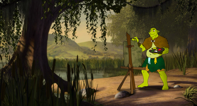 A hithero unnoticed door opened in front of his eyes. A small, green and hideously warty humanoid figure leaned out, pointed at a colour-encrusted palette in one clawed hand and screamed at him.