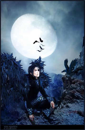Beautiful elegant night scene, I love the beautiful make inΒ the dark cloak, there is something sinister/powerful about his pose and presence but very enticing. Gorgeous blending of the night sky and I love the artistic border of roses and thorns.
