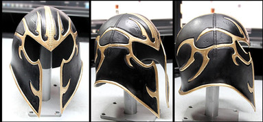 Krypton Leather HelmetDesign derivative of the Kryptonian Armor Jor El wore in Man of Steel. This is leather painted to look like metal however it is of interest to note that the art direction in the film ruled out metal designs for anything on Krypton.