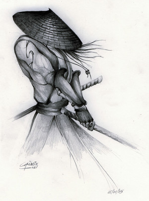 Wrong form he'd get himself killed holding his sword upside down like that lol you draw it with the blade up so you can quickly and accurately draw it out or even slag if you wanted too but if it's the other way around like you have there he'd have to draw it straight up not only that but flip it to properly hold his sword not the best idea when you have another Ronin coming at you with intent to kill you but other than that this is one badass picture man excellent job (sorry for nit picking ^^')