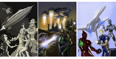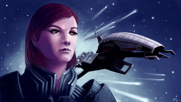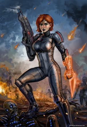 Just your typical depiction of our hero archetype(chose fem-shepard for this) with a clash between the Normandy and a looming Reaper.