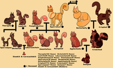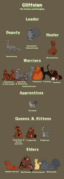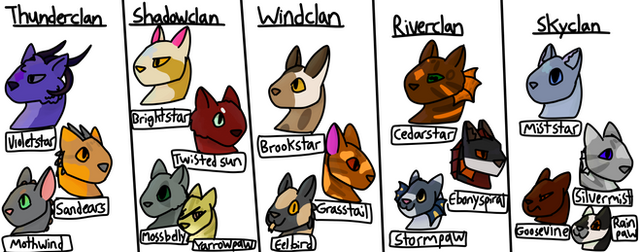 The peppy and foresty neighbors of Prairieclan! Like Prairieclan they have an overwhelmingly lack of toms but that's only because there hasn't been a male birthed since Thriftpaw!They're not too worried, since currently they're focused on helping Sparrowheart; the other medicine cat unfortunately passed and the usual neurotic Sparrowheart has been in a nervous tizzy ever since going so far as to lick her fur clean off!