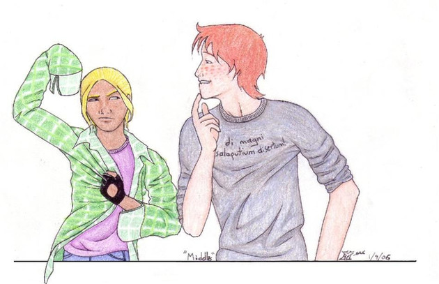 Guess what time it is, guys! That's right, it's the yearly tradition of the BaaingTree going head-to-head with PaintShop Pro8 and getting her wooden butt served back on a plate! And guess what happened this year? She got her wooden butt served back on a plate. Boy howdy, who'da thunk it? PaintShop Pro8 was determined to kill me this time. At least four times during the coloring process, it deleted chunks of layers, added lines and changed colors, and finally changed it from layer to layer. It pixelized the flat colors beyond recognition, so I had to go through and fix it up, and some of the lines make me cry because I had to use the mouse to redraw them. By the time I saved the final thing, I was so sick of it that I gave up on keeping it from being compressed, so Raige's hair looks like some kinda skin on a purse. Finally I just saved it as a bitmap out of disgust; even though DA won't let me submit that version, I can at least point and say, "Ha! Once, my son, I was able to USE the program!" Sorry about the poor quality. Grrraaaaah. Grah, grah, grah. Now I remember why I indulge in this tradition only once a year.And yes. I was inspired by the fanart100 challenge. (Don't know what it is? Check it out: [link] ) Don't know how, seeing as I've been artistically dead for a while, but it did. Only since I draw fanart about as often as I tackle PainShop ProHate, I decided I'd use it for mine own purposes. In this case, M.D. and Raige. Ah, the beginning of a beautiful friendship.