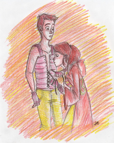 Lord. If I draw at the average rate I do, I will probably finish the fanart100 prompts in oh... ten years. Nine at bottom. Note that this time, I learned my lesson and didn't go anywhere near PainShop ProHate. (Painshop: "Booya!" *victory dance*)So... yes. Middles. M.D. (cranky girl on left) would like to have everyone believe she is impervious to guilt, and on the most part, it's an effortless state of being. However, there is a limit to the amount of abuse even she can dish out, especially to someone as unoffensive and unforgivingly generous as Raige (guy on right) is. He pretty much takes the Nice Stick and beats her over the head with it until she succumbs. This is a little before that point, and she's still putting up a fight, but after accepting his jacket, she's close to just giving up, and he knows it. Maybe that's why he looks so amused.