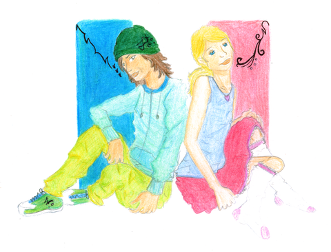 In general, I'm happy with the penciling, even though coloring green plaid is proving to be less than fun. (Except when I'm stuck in an Anatomy lecture with no attention span. Then it's good.) However, there is one thing that bothers me. When I first drew this, I planned to have them both sitting down. Unfortunately, I misjudged the amount of paper space I had, and as a result, it looks like they're standing and that I simply screwed up my proportions. Though M.D. makes up for it in volume, there is a huge size difference between these two, which is what I was trying to convey with the jacket. It's too small for Raige, but fits her like a tent. Unfortunately, due to my lack of brain, I screwed it up. So pleh.