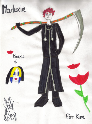 My arttrade to Kiro-Kina. Its her famous nobody, Kinaxis. In the background is fire for she can use fire like Axel, but shes stronger than Axel. Also, i put one of Marly's flowers on fire. A reference to my first comic.[link]Related content