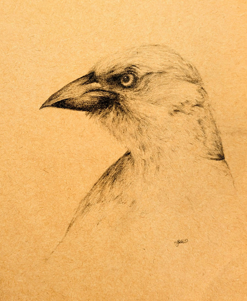 Linoprint 4 x 6 inches.I think he is called a grosbeak. thick and chunky bird with a tough looking beak. He came to the feeder everyday one winter and stuffed his face with sunflower seeds. This one was black and white with a bold red patch on his under side