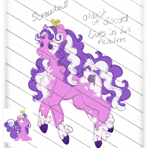 After Discord escaped from his stone prison and went to wreck havoc on Ponyville he created many creatures in his nonsensical image. He created many thing winged toads, long legged rabbits and more. But Screwball was special, she was a pony made of chaotic energy, an earth pony in vision but full of magic. She had the ability to fly, cause illusions and most this discord could but to a lesser extent.