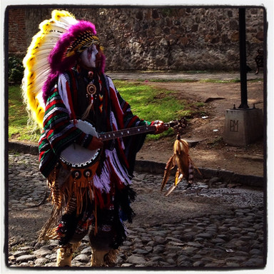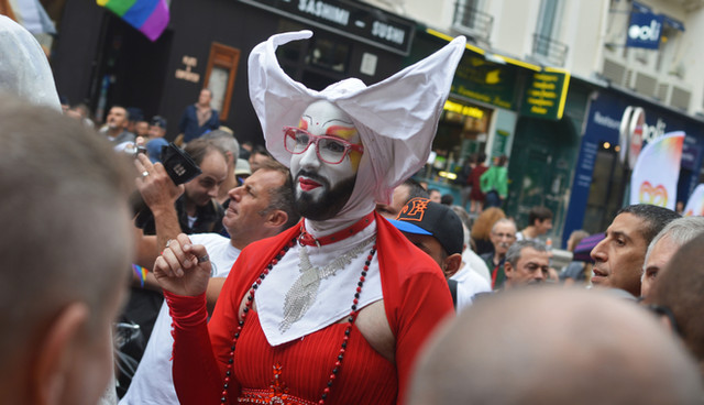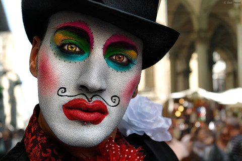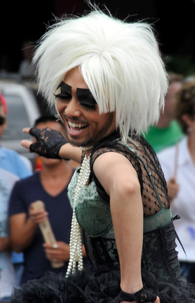 Weird funny guy showing up during the GP parade in Madrid .I actually thought he was an old lady and thought this would be an interesting shot... an old traditional lady following a gay pride parade but when he turned his head and looked at me shooting I let a wtf out and we started laughing.You can see the entire photo set at [link]