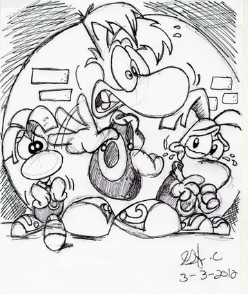 This is supposed to be Rayman and Globox holding hands and Murfy has caught them while they were out. Therefore, their secret hideout isn't so secret.I don't own Rayman or any of the characters, they belong to Ubisoft.