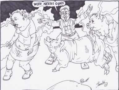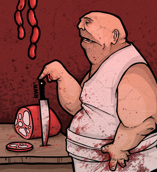 Just a random drawing for fun. Pigs running the slaughterhouse for the human meat. What if pigs or cows doing the people's work at the slaughterhouse.Related content