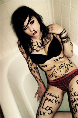 I'm guessing that the meaning of this photo is to illustrate how some girls feel powerless to dispel rumors and false labels that others have made for them. In this case, the subject in the photo fells like she can't stop people from thinking that shes everything thats been written on her back.