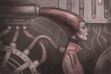 Cool! I like this very much! And my eyes are so drawn to the girl and the machine that I didn't even notice the background was a series of shapes, hunts at something more without being. Really cool!