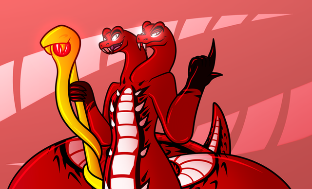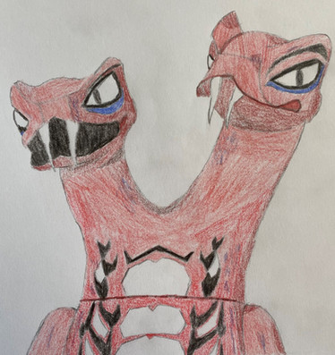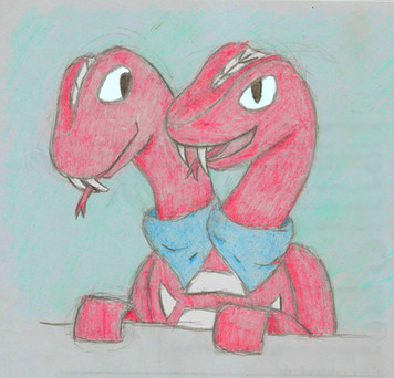 The finely line and wispyness of his jaws, eyes, throats, and necks is simply eye catching. Great job! Oh, the teal gray background really does wonders with the bright hues of the Fire Engine red scales.