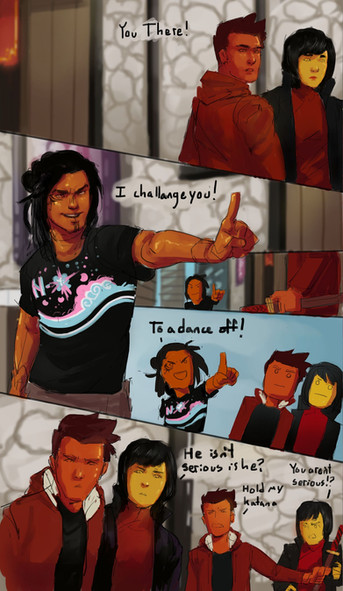 Cole's face is priceless! and Zane and Kai's big huge grins while they push Cole forward.Β