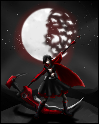 This is, like I'm beginning to realize your art is wont to be, a very powerful piece of RWBY fanart. The rich, royal blue in the night sky, and the pale glow of the moon, perfectly contrasts with the black arms of the beasts dissolving into red petals. The raised claw almost seems to point to Ruby, as does her scythe's re-curved blade, and the length of its handle. You have a very powerful pyramidal structure going on in that respect, inevitably leading the eye up to Ruby. Right on.