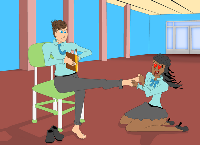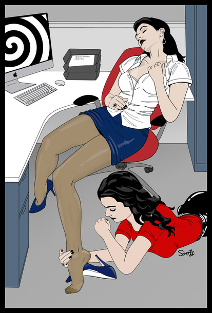 One idea I had was this took place in the 80s; I was thinking of women that had hair like this back then.Anyway, the usually conservative, well-behaved Sheila gets a bit naughty at the office Christmas party. She's using mistletoe to make the accountant kiss her feet.