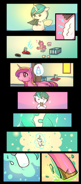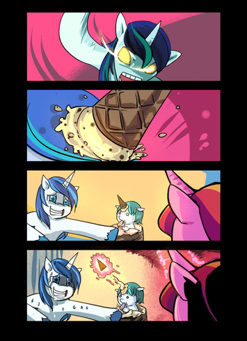okay, chrysalis send the child of Shinning and her to shinning, Candance found out and threw shinning out, but fell in love with the baby, which got hungry so she left to get some milk for it, then the baby transformed into Candance and assaulted Luna for some bread, after winning it tranformed into Luna and now seems to have found some more food.