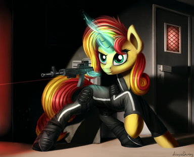 Sunset Shimmer, a former student of Celestia's, now works as a smuggler for anyone with good enough cash, all while avoiding rival employers and Twilight's Royal Guards.