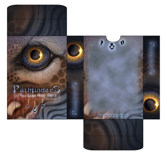 My entry for the design of the card deck box. It started out as a very loose open canvas sketh that blurbed out my rough idea. All I knew at that time is I wanted something symbolic..and somehow the idea of animals being pathfinders got me to thinking about the moon and its mysterious ethereal qualities. After the initial sketch I actually did not intend to color it...the inspiration kinda went astray and so I left it be. Then one day for whatever reason wanted to color it. So I did..without much thought as to what I wanted as the end product. The only thing that remained a constant is I wanted to incorporate the moon somehow and kinda give a dreamcatcher feel to it somehow. So while looking at photos of eyes..I suddenly thought of a solar eclipse..the pupil serving as the moon. Also incorporated patterns of various animals in the design, from top left to bottom right: hawk feathers, simple white fur(could belong to a multitude of animals), leopard spots, tiger stripes, giraffe spots, moth/butterfly wing, xebra stripes.