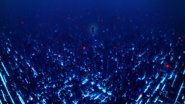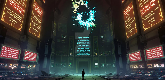 seems like he'll be crushed any second, maybe inside a cyberworld?