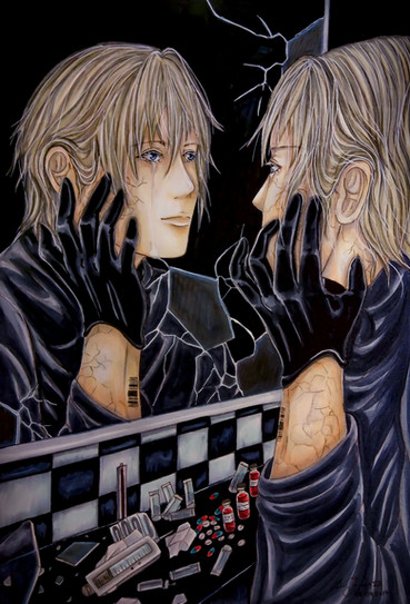 I can't help but to admire this peice. The reflection in his the mirror being different with wings/outfit than his actual person. It's all sexy.