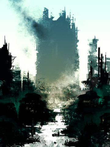 I really like this. First because you do so much with flat color areas. Next because you chose an unusual pale pastel greenish/brown color scheme rather than the usual blacks and reds and sickly blues. Third because you add in atmospheric perspective. It looks like a polluted sky on a very hot day, as if the apocalypse was a solar flare or some heat-related disaster. And finally because there are no monsters or obvious scary things in the picture, just desolation.