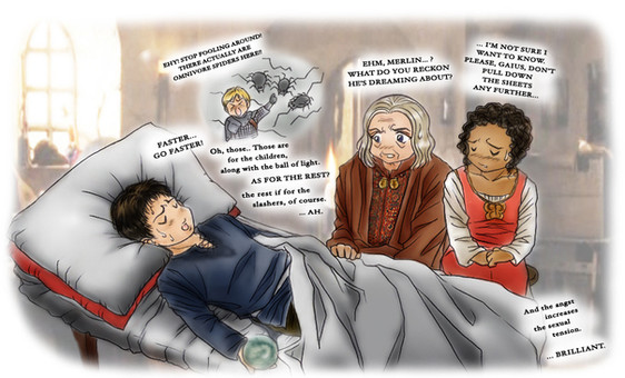 Needless to say, if I had a choice Iād go on an adventure with Merlin XDReference to the beginning of the 4th season, where Merlin gets (not) mortally injured by weird ghost-things, and when Lancelot goes to take him back to Gaius they spend the night peacefully sleeping by a lake while Arthur and his knights go traipsing through a cave filled with GIANT (baby) rats.