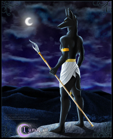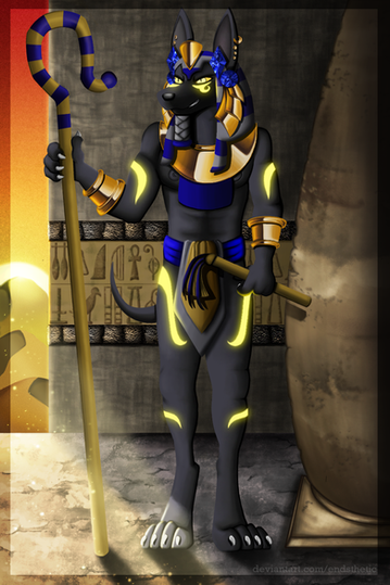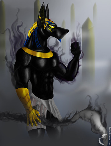 Anubis is one of my favourite gods in Egyptian mythology. I have drawn him many times, and each time I have drawn him slightly different. but each time I've always depicted him with the same personality, a strong warrior, a smug and proud personality, but a gentle heart.I will admit that the secondary light source is feeling a little off. but with him being grey in skin tone and the main light source being blue and the background blue, the bounce light would just be blue or silver, so I added the yellow light to add contrast. please let me know what you think, feedback always helps.