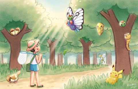 OHHHH MAN this looks sooo amazing. I didn't expect to make such a big improvement so quickly. the caterpie looks especially good.I still can't draw forests like at all... It doesn't look bad but it would be nice to draw some bushes or something. I might start putting pokemon in larger groups after beedrill.