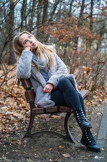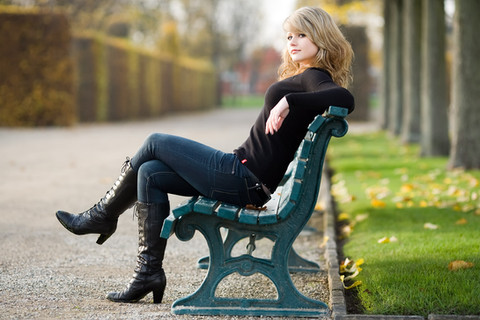 I love the colors in this. The saturated yellows and greens in the background. The soft brown tints from the leaves on the ground that match well with her hair and skin. And then there's that big contrast from her boots and legs.Β But the most important part is that the subject/model still stands out from the rest. And you've made good use of the rule of thirds.Β