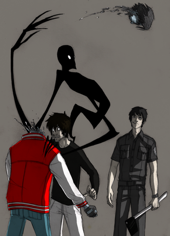 Oh man, do you remember that show Freakazoid? this looks like Candle Jack. Just a bit, the eyes mostly. But I love the "what joo lookin at bitch?" expression on the masked guy's face. well, the expression is more in his body, not his face. if that makes any sense.