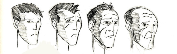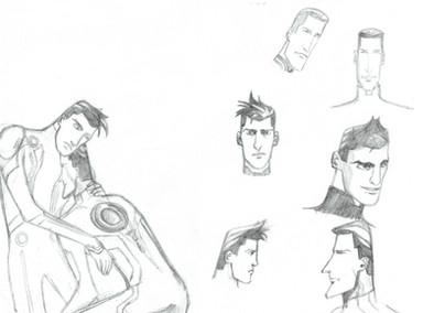 On the left are screenshots of a character from Portal 2 named Wheatley, on the right are my interpretations of him as a human