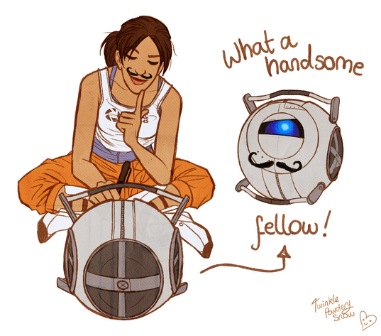 Stupid apple again!!This was spawned by a post made on tumblr about Wheatley's mysterious unidentified sticker: [link] They decided it was a fruit sticker Chell stuck it on there. Anyway, I had to draw tiny science fair Chell.