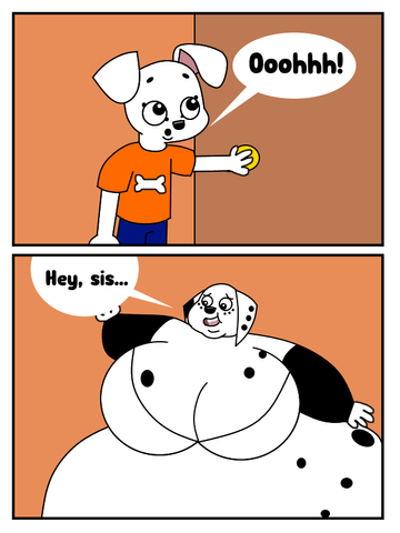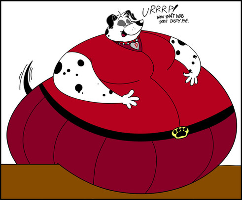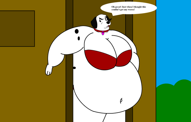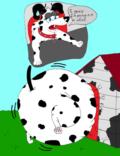After getting stuck in her doorway, Ruby now struggles to push her fat body through the door. It was a tight struggle, but eventually she manages to get through.Ruby Dalmatian belongs to me.