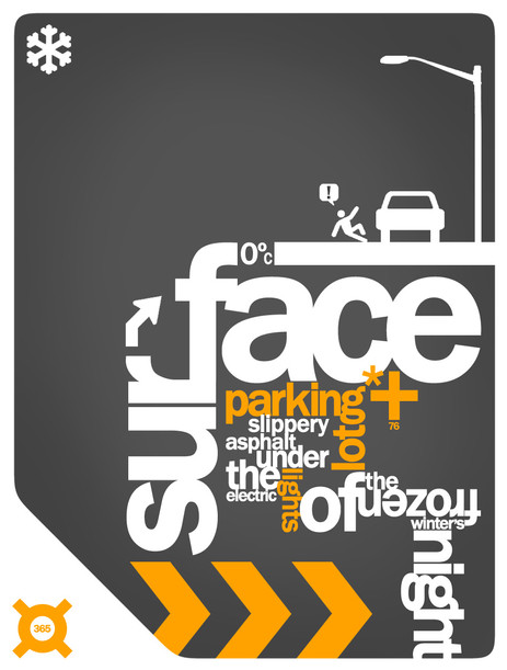 A little typo-art about the unpleasant surprise of frosty weather!'Surface.. zero degrees celcius. Parking Lot.. slippery asphalt under the electric lights of the frozen winter's night...'