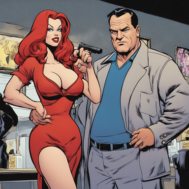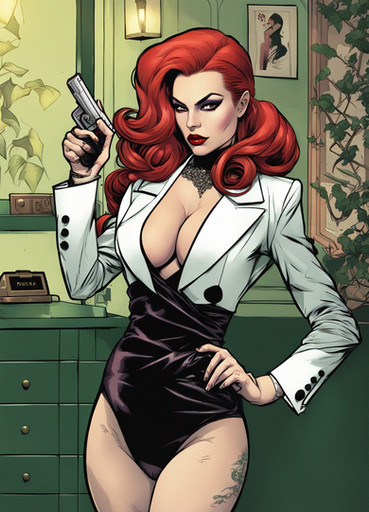 #cartoon #digitalart #fanart #characterdesign #vintage #redhair #noir #blueeyes #character #comic #comicart #femmefatale #gun #gunslingergirl #largebreasts #oc #occharacter #orangehair #reddress #redheadgirl #seductive #thickthighs