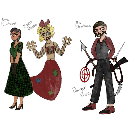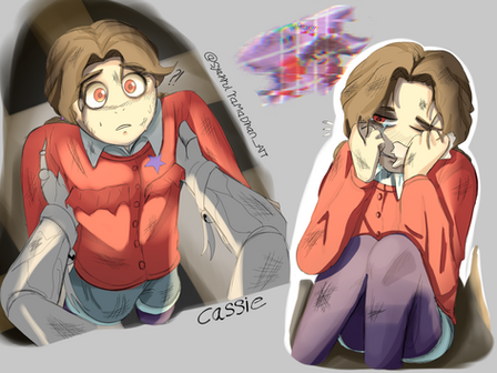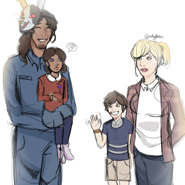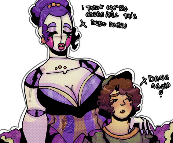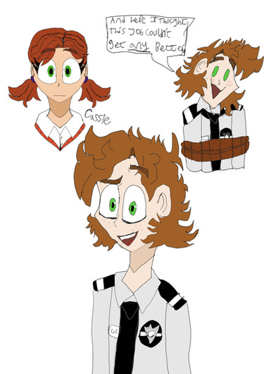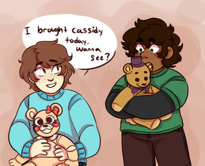 this is a drawing i made based off of another but I drew my OC Freida in the place of Michael and Cassie in the place of Gregory, the text has minimal difference from the original since i did quite like it due to it being funnyFreida Afton's current redesign and the one i'm most pleased with from how it turned out. and below is a small description of her new lore
