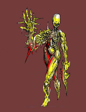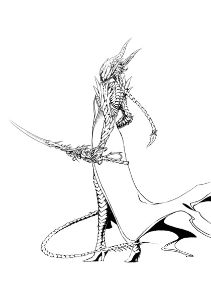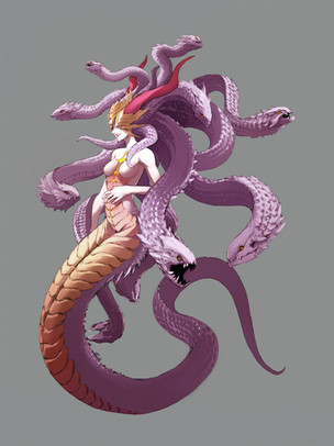 She is depicted as an ugly viper , but when he changes shape, she puts himself in human shape, with big teeth and two horns. When in human shape she carries a sharp and bright sword in her hand.