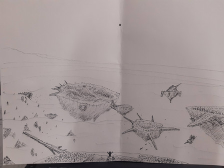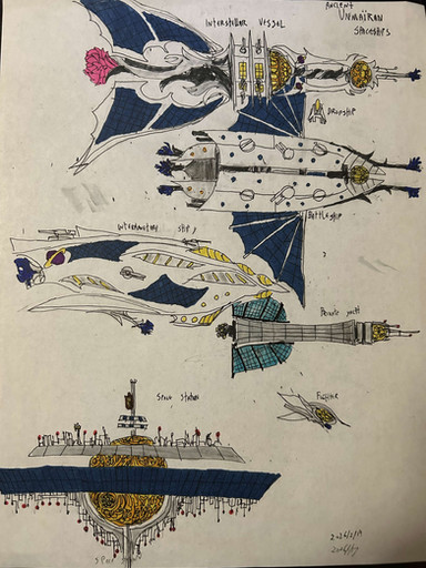 Some starting design work for Turing the main lamp ship character for my thing. not sure how close I am, the "wings" are solar sails used in sub-light travel, along with some plasma drive that are I have to figure out were they go, I'm thinking in the back tentacles will open up and have them on it.Designing space ships is harder them I thought, though fun.