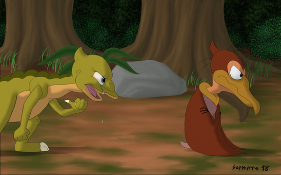 Petrie took a deep breath and held Pterano's wing. "Can you tell me about girl fliers?" He asked. Pterano's beak dropped slightly. "What?!" He asked. Petrie looked up. "You surprised?" He asked. "It's...not what I expected...um...but you are at that age..." Pterano put his hand on his head. "Oh dear, I was not counting on this." He flustered.