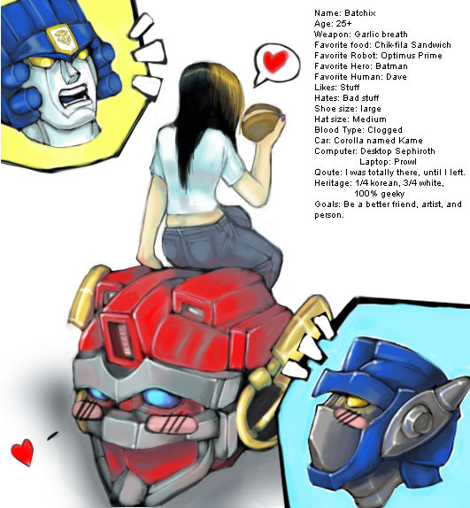 for being an OC of a cross between the 2 most ever popular bots, Jazz and SS, she's pretty awesome... i think its the artist who successfully avoided becoming a Mary Sue.