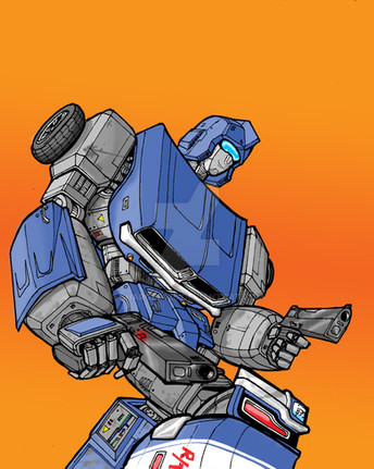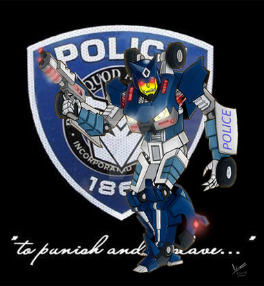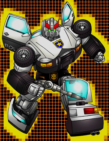 When i sat and thought about it, I realized that Sgt. Nick Angel from Hot Fuzz reminds me of Prowl. So and I joked about it... and this picture was born. I've been working on it off and on for a while now. I hope to make a t-shirt of it for my trip!transformers and prowl belong to hasbro/takara