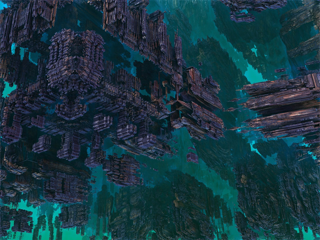 Futuristic scenery with Mandelbulb 3D 189MixPinski4, _SinY, _reciprocalY3b and ABoxSphereOffset4d.