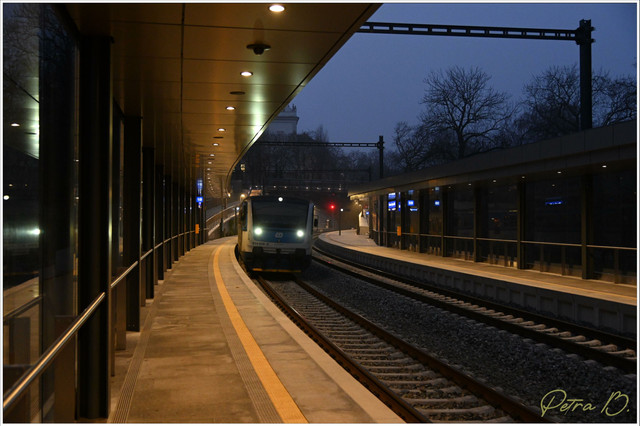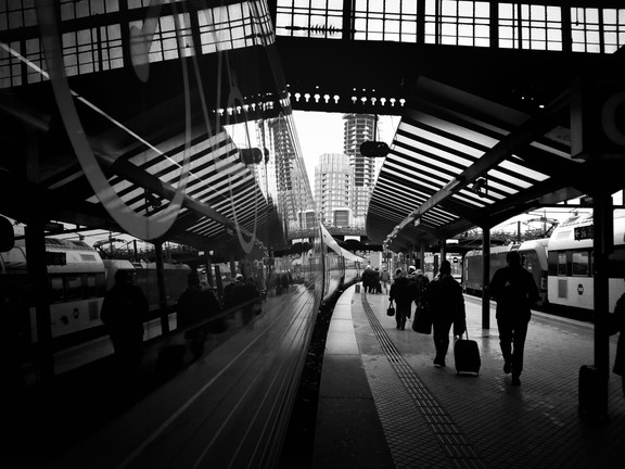 The perspective is really strong. Due to the shape of the platform, the trains seem to be entering on different planes (in an M.C. Escher sense) if you unfocus your eyes a little bit.