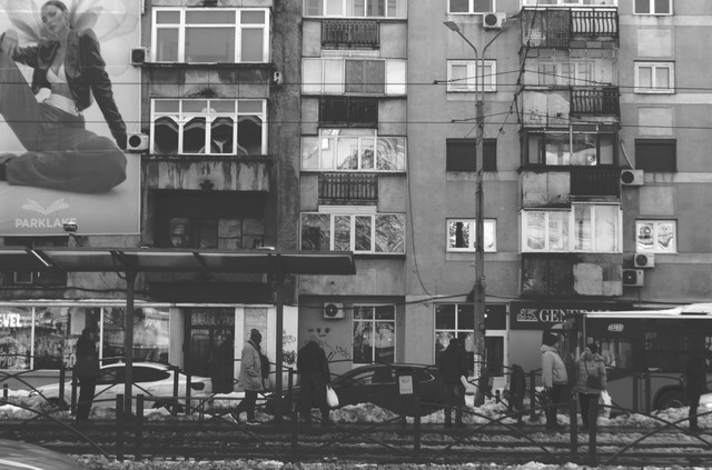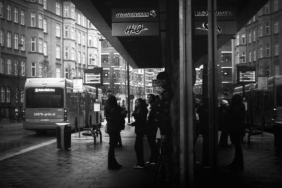 #people #reflection #snow #station #street #trasportation #waiting #blackandwhite