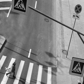 I love the light, shadows and composition.ย It looks like the human is depending on the dog to guide them, and the dog looks so happy!