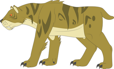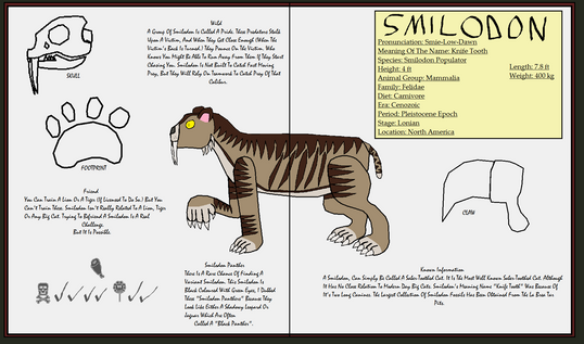 Smilodon was a large genus of saber-toothed machairodont cat that lived before, during, and shortly after the Ice Age. The genus was originally native to South America, but at the start of the Ice Age, they quickly populated North America where they could finally eat something that wasn't an oversized armadillo. The largest species, Smilodon populator, was roughly the same size as a modern lion, but was much stronger, more durable and robustly built than any other cat living or extinct. Such immense strength allowed Smilodon to easily kill larger prey single-handedly. After incapacitating its prey, Smilodon would then kill it using its massive canine teeth to bite the corotid artery, resulting in the prey's inescapable death. When not in use, these menacing teeth were concealed by extended lips, keeping them moist, sharp and protected from decay. Smilodon also had a massive jaw gape that allowed it to open its mouth wider than any other living cat, giving way for its canine teeth while giving a death bite. Smilodon, along with many other species of American megafauna, went extinct 10,000 years ago.Related content