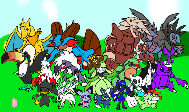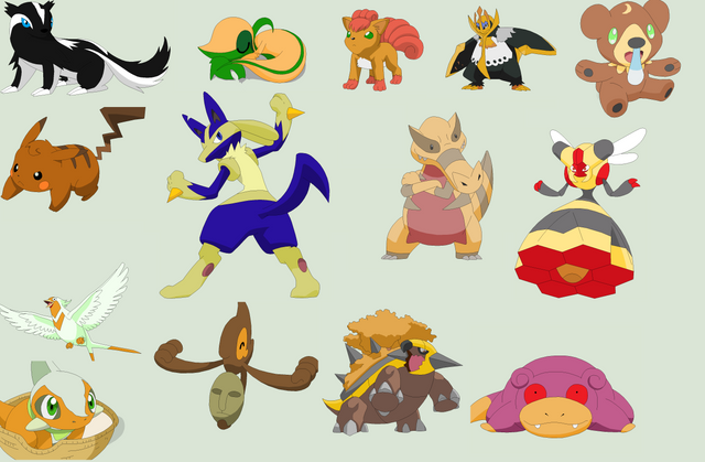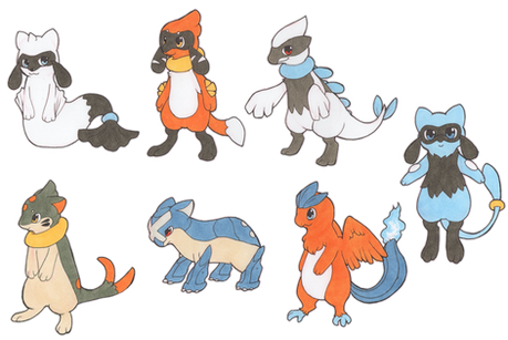 Middle row: Lucario, Pikachu, Fish creature (Adopted from DasolX ), Greninja